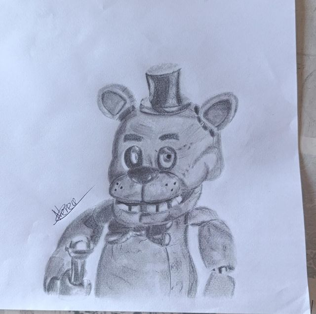 Detalles del productoLápiz grafito sobre papel. Dibujo a mano del icónico Freddy de Five Nights at Freddy's 1. - Representación detallada del personaje. - Excelente estado. - Perfecto para fans de FNAF.