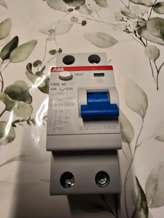 Interruptor diferencial ABB F202 AC. - Intensidad nominal: 63A. - Corriente residual nominal: 0,3A. - Tensión nominal: 230V. - Poder de corte: 1000A / 10000A.