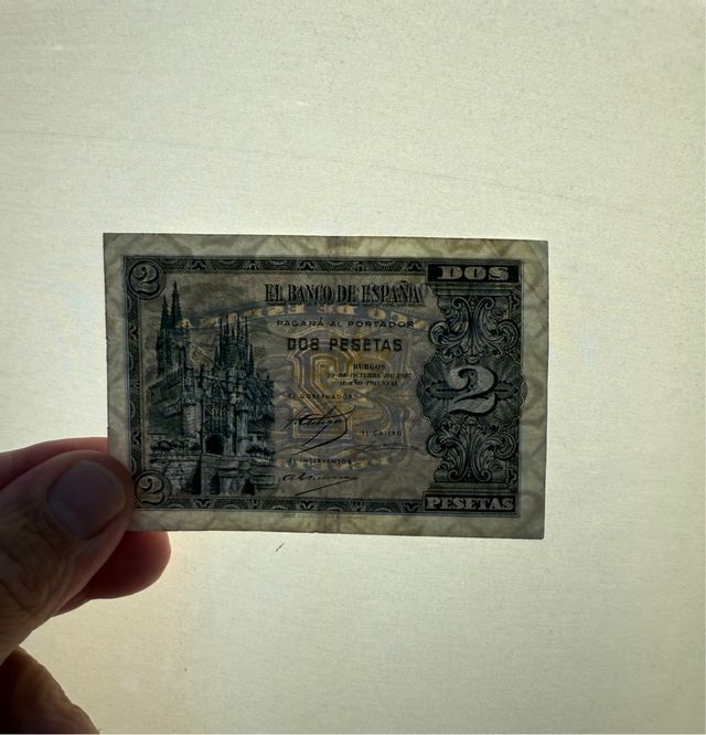 Detalles del productoBillete antiguo del Banco de España con valor de dos pesetas.