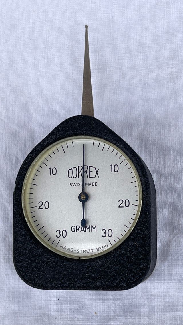 Dinamómetro Correx de fabricación suiza, con una capacidad máxima de 30 gramos. - Escala graduada en gramos. - Diseño compacto y robusto. - Fabricado en Suiza.
