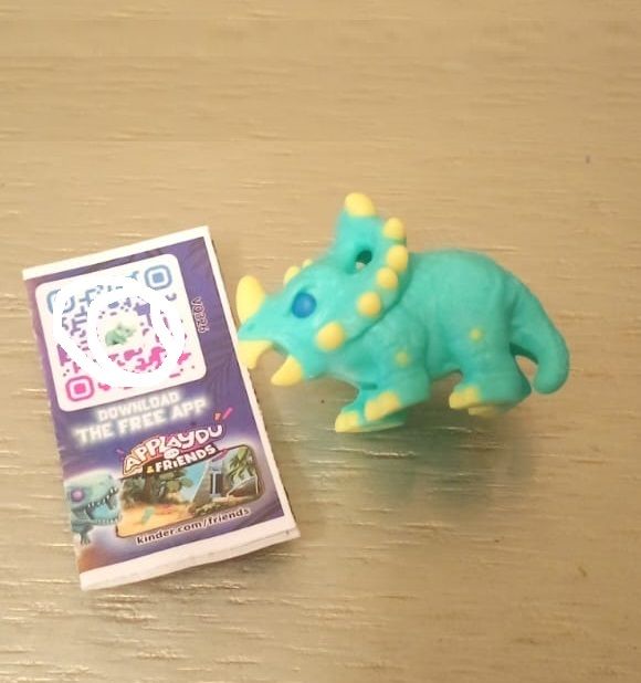 Figura de dinosaurio de Kinder Joy. - Color azul turquesa con detalles amarillos. - Diseño de Triceratops.
