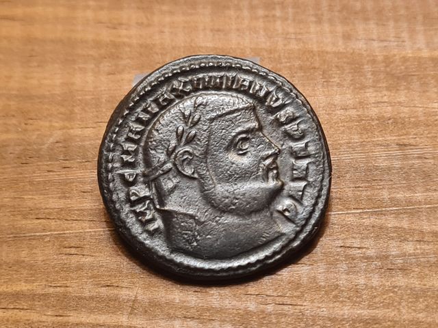 Detalles del productoMoneda de la época del emperador romano Marco Aurelio Valerio Maximiano (apodado Hercúleo) años 285 a 305 DC (compartió cargo con Diocletiano), reverso Genio