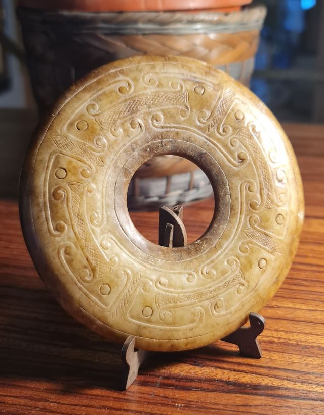 El objeto en la imagen es un disco Bi chino hecho de nefrita, probablemente de la dinastía Tang. Los discos Bi son artefactos antiguos de jade con un agujero en el centro, que se cree que simbolizan el cielo. La nefrita es un tipo de jade muy apreciado en China, especialmente la variedad de color "grasa de cordero". Estos discos se han encontrado en tumbas neolíticas, a menudo cerca del cuerpo de los difuntos, y se asocian con el cielo en la tradición china. 2025-COL0649