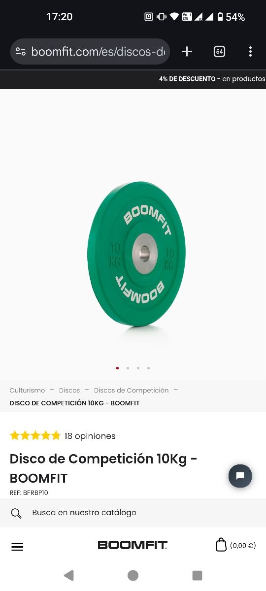 Detalles del productoPesas de disco para barra de halterofilia de la marca BOOMFIT, con un peso de 10 kg.