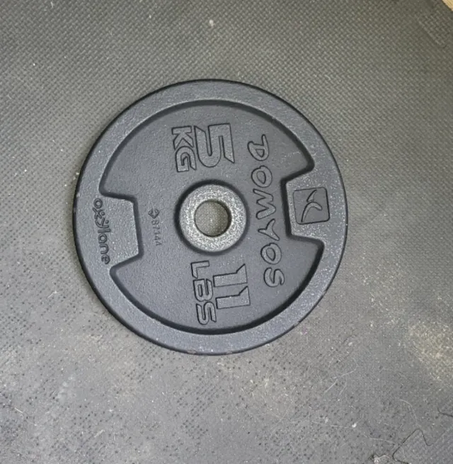 Disco de pesas de la marca Domyos. - Peso: 5 kg (11 lbs). - Material: Hierro fundido. - Diámetro interior: 28 mm. - 2 discos por 20 €