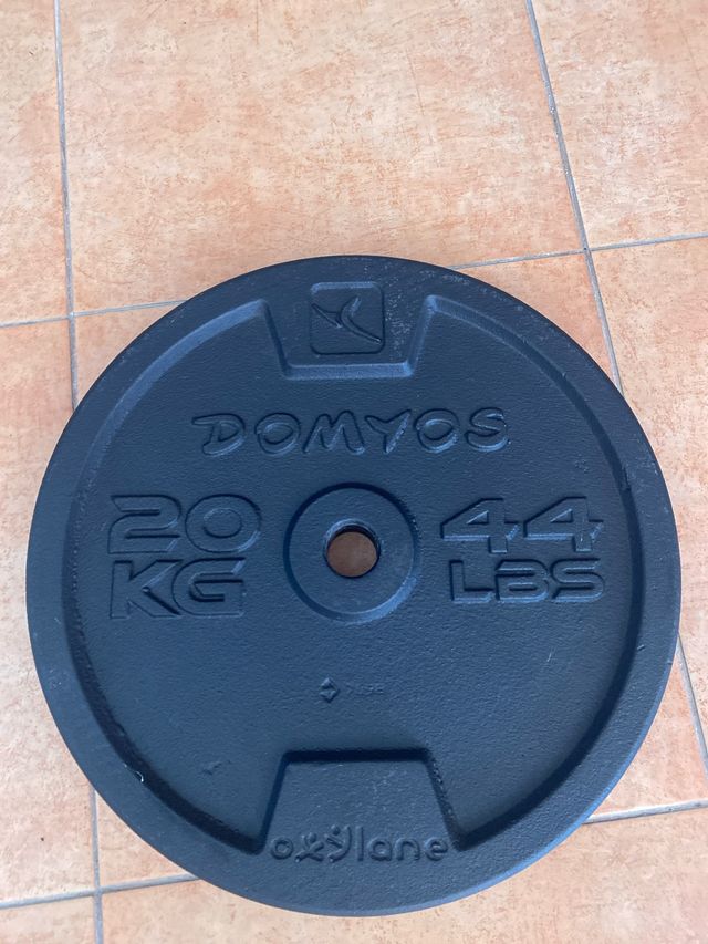 Disco de pesa de 20 kg de la marca Domyos. - Peso: 20 kg - Marca: Domyos - Medida en libras: 44.4 LBS - Logo de Domyos - Logo de Oxylane
