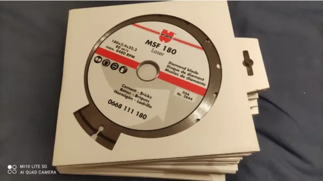 Disco de diamante Wurth MSF 180 Laser para corte. 80m/s. - Medidas: 180x2,4x22,2 mm. - Velocidad máxima: 8480 RPM. - Uso para cemento y ladrillos.