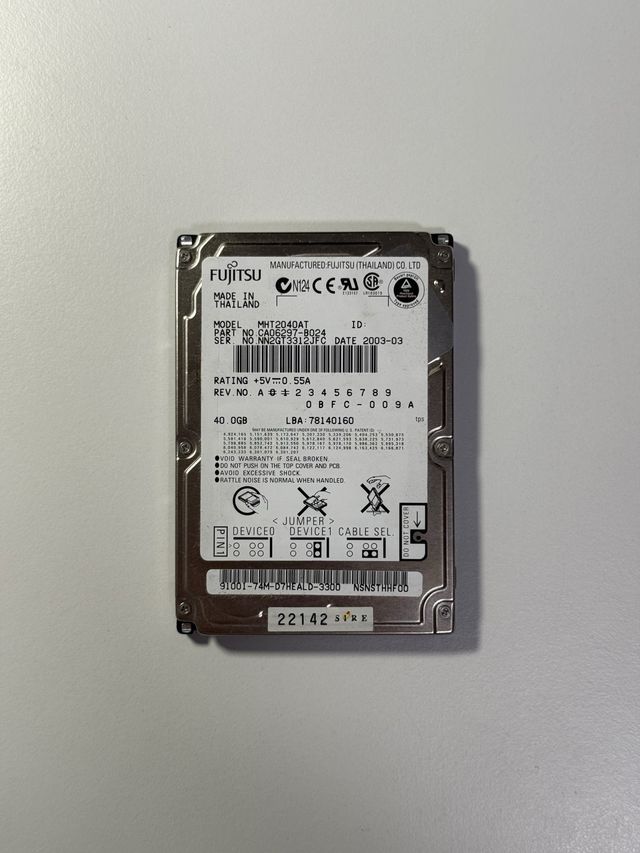 Detalles del productoVendo disco duro Fujitsu de 40GB, modelo MHT2040AT, con conexión IDE/PATA