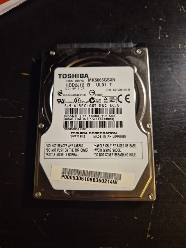 Vendo disco duro Toshiba MK5065GSXN de 500 GB. Se encuentra en buen estado. - Modelo: MK5065GSXN - Capacidad: 500 GB - Interfaz: SATA