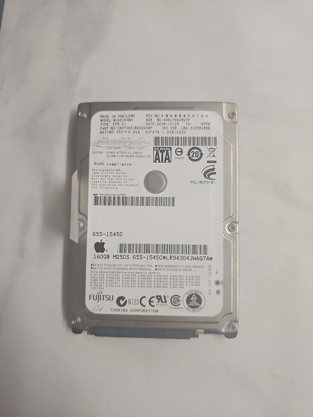 Disco duro interno de 2.5 pulgadas para equipos Apple. - Capacidad: 160 GB - Modelo: MJA2160BH - Fabricado en Tailandia - Conexión SATA