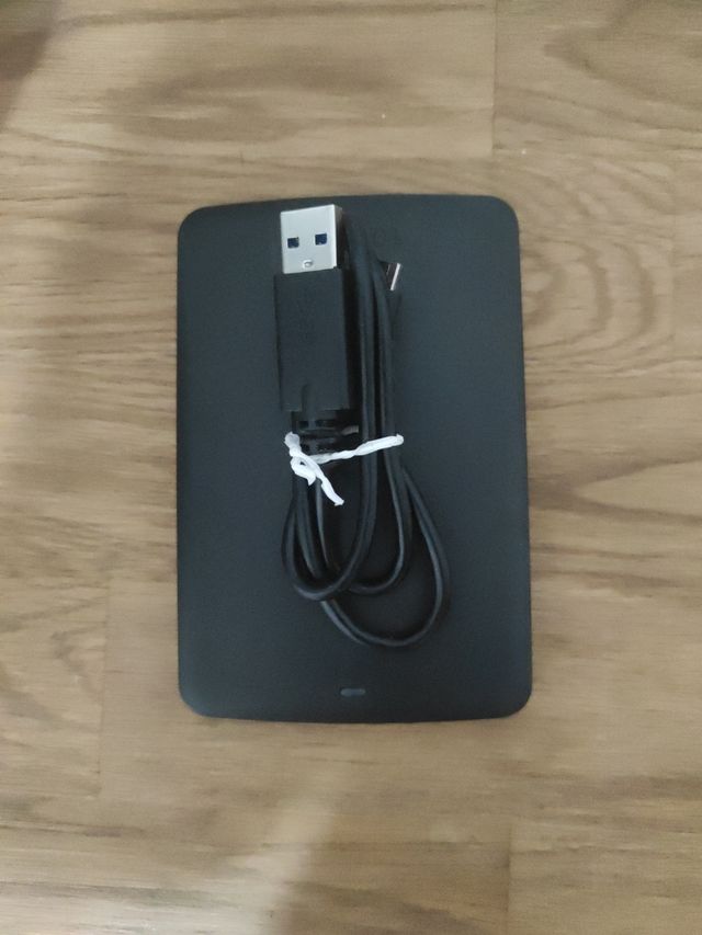 Disco duro externo de color negro, con cable USB incluido. - Diseño compacto y elegante. - Ideal para copias de seguridad y almacenamiento de datos.