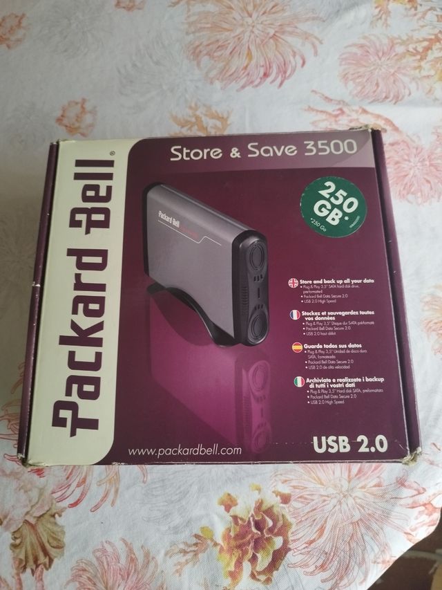 Detalles del productoDisco duro externo de 250 GB. Es bastante antiguo. Va a la corriente y con un USB al ordenador. El disco duro tiene unas pequeñas rayadas en la parte de abajo que apenas se ven. Al conectarlo marca 232 GB de almacenamiento total. Marca Packard Bell. No lleva el soporte de plástico que viene en la foto de la caja.