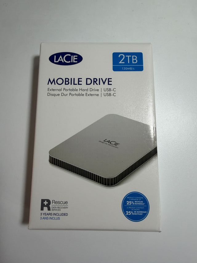 Detalles del productoDisco duro externo portátil LaCie Mobile Drive de 2TB con conexión USB-C. Incluye servicios de recuperación de datos Rescue. Sin abrir, precintado