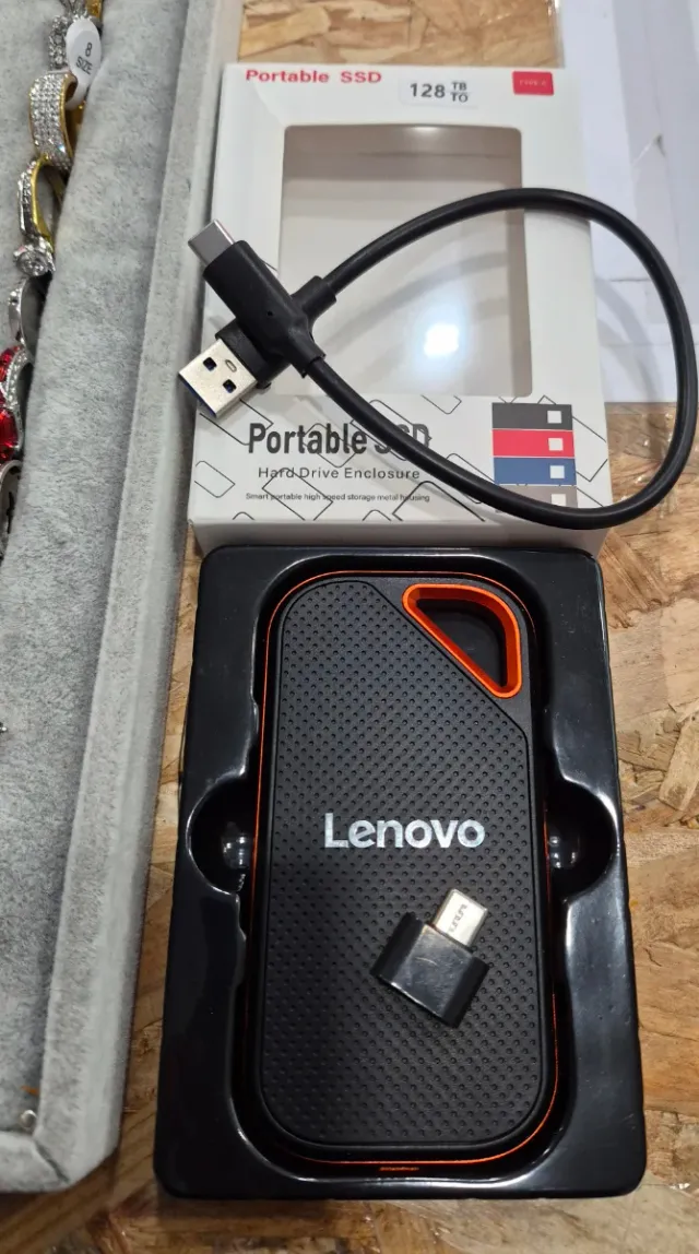 Disco duro externo portátil Lenovo. - Capacidad de 128 TB. - Diseño robusto con detalles naranjas. - Incluye cable USB-C a USB-A y adaptador.