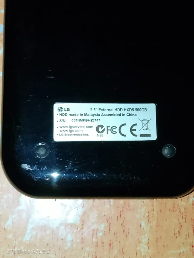 Disco duro externo LG de 2.5 pulgadas. - Capacidad de 500GB. - Modelo HXD5. - Fabricado en Malasia, ensamblado en China. -Cable incluido