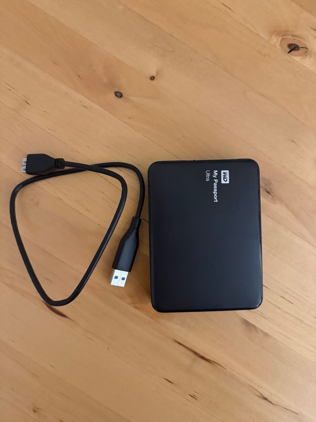 Detalles del productoDisco duro externo portátil de 2TB, ideal para copias de seguridad y almacenamiento adicional. Incluye cable USB.