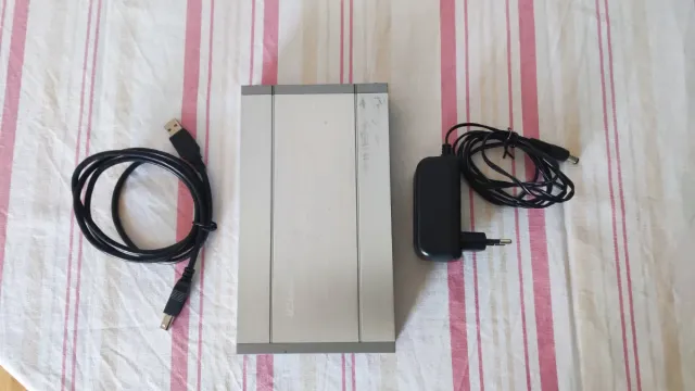 Disco duro externo de 1TB con acabado plateado y gris. Incluye cable USB y adaptador de corriente. - Capacidad: 1TB - Conexión: USB - Incluye adaptador de corriente