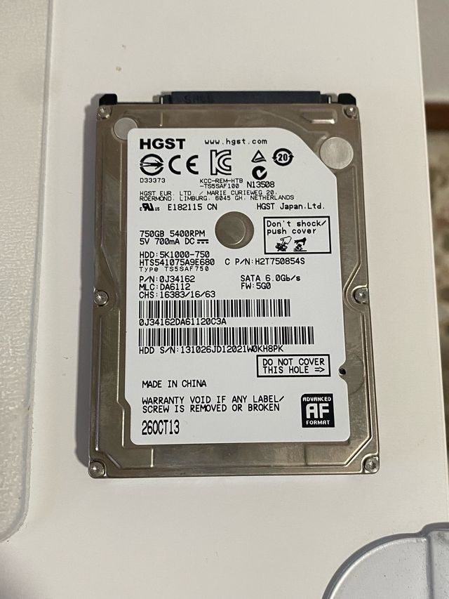 Disco duro interno HGST de 750GB con una velocidad de rotación de 5400 RPM. - Capacidad: 750GB - Velocidad: 5400 RPM - Interfaz: SATA 6.0Gb/s - Modelo: HTS541075A9E680