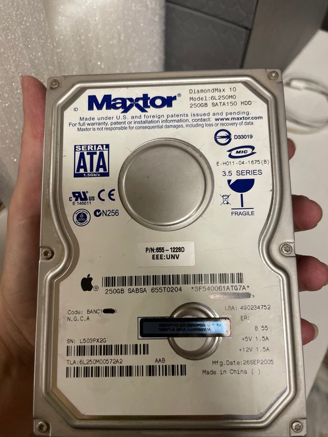 Disco duro Maxtor DiamondMax 10 de 250GB. - Modelo: 6L250M0 - Interfaz: SATA 150 HDD - Serie: 3.5 - Fecha de fabricación: 26 SEP 2005 - Fabricado en China