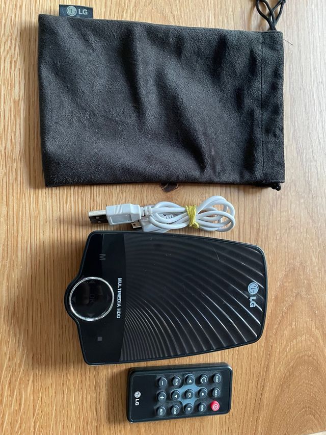 Disco duro multimedia LG de 500Gb con mando a distancia. Tiene salidas HDMI, AV, USB y DC. Va con cable incluido