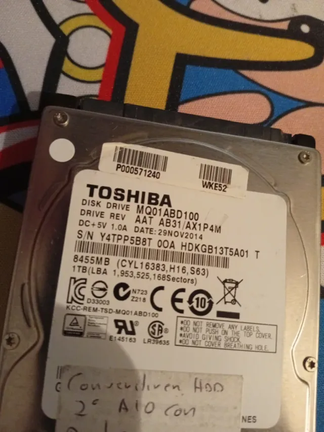 Disco duro interno de 1TB de capacidad. Modelo toshiba. - Capacidad: 1000 GB - Interfaz: SATA - Velocidad: 5400 RPM - Fabricado en China