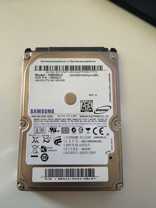 Disco duro interno Samsung de 500GB. - Modelo: HM500JI - Capacidad: 500.0GB - Velocidad: 5400rpm - Interfaz: SATA - Fabricado en Corea.