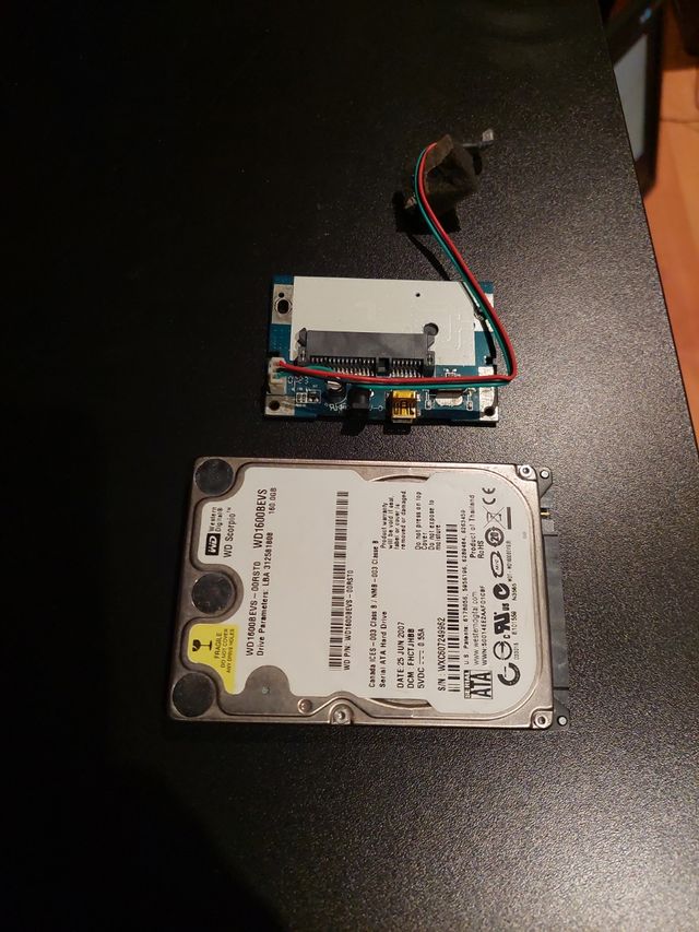 Detalles del productoHDD externo Western Digital WD1600BEVS. De tamaño 2,5". Funciona perfectamente. Formateado. Incluyo adaptador SATA a micro USB (que no sé si aun funciona, hace tiempo que no lo uso).