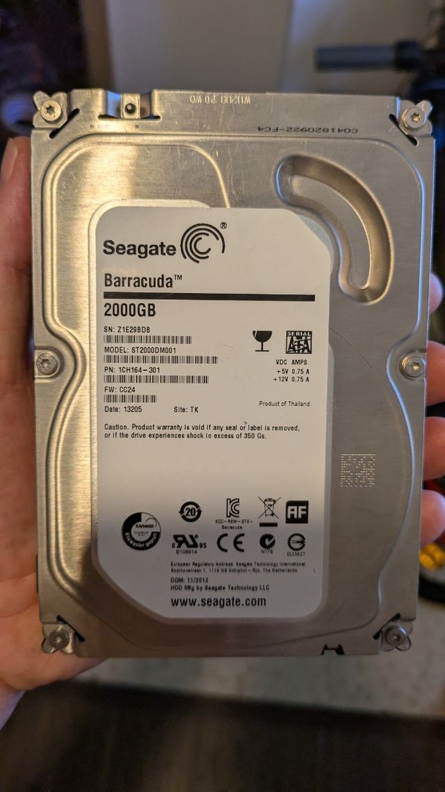 Disco duro interno Seagate Barracuda de 2TB. - Modelo: ST2000DM001 - Capacidad: 2000GB - Número de serie: Z1E29BDB - Firmware: CC24 - Fabricado en Tailandia.