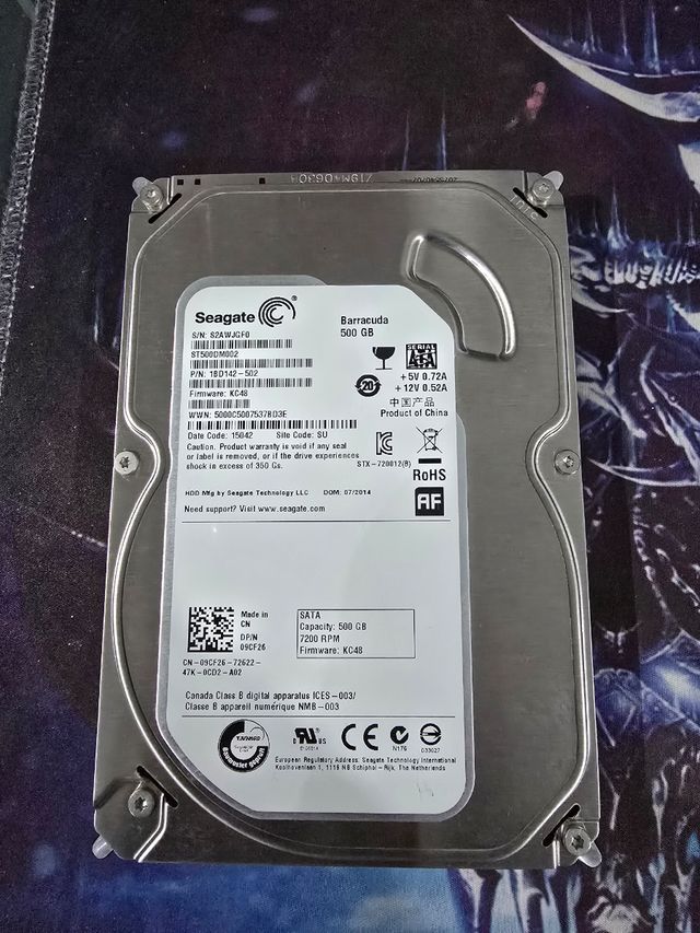 Disco duro interno Seagate Barracuda de 500 GB. - Modelo: ST500DM002 - Capacidad: 500 GB - Velocidad: 7200 RPM - Interfaz: SATA - Fabricado en: Julio 2014