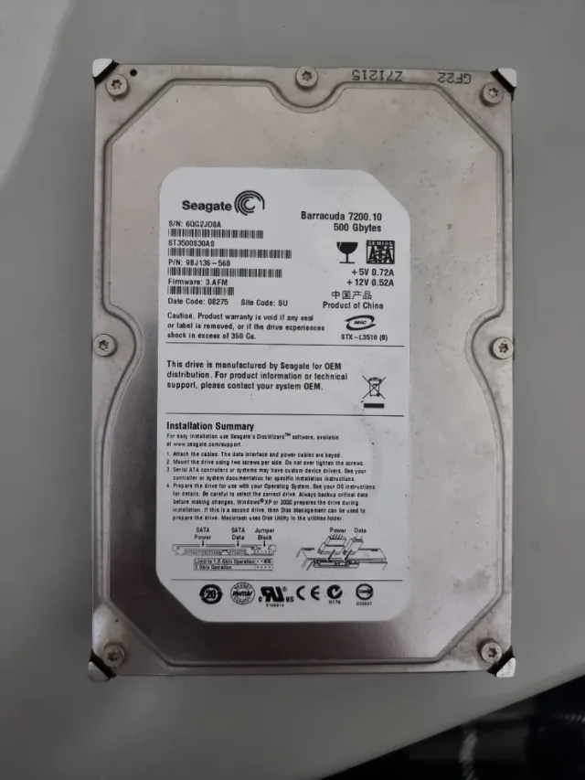 Disco duro interno Seagate Barracuda 7200.10 de 500 GB. - Capacidad: 500 Gbytes - Modelo: ST3500830AS - Interfaz: SATA - Velocidad: 7200 RPM