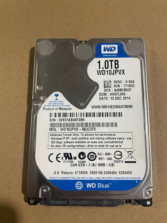 Disco duro interno de 1TB. - Modelo: WD10JPVX - Capacidad: 1TB - Interfaz: SATA - Están formateado bajo nivel, y testeado, 100% clusters correctos