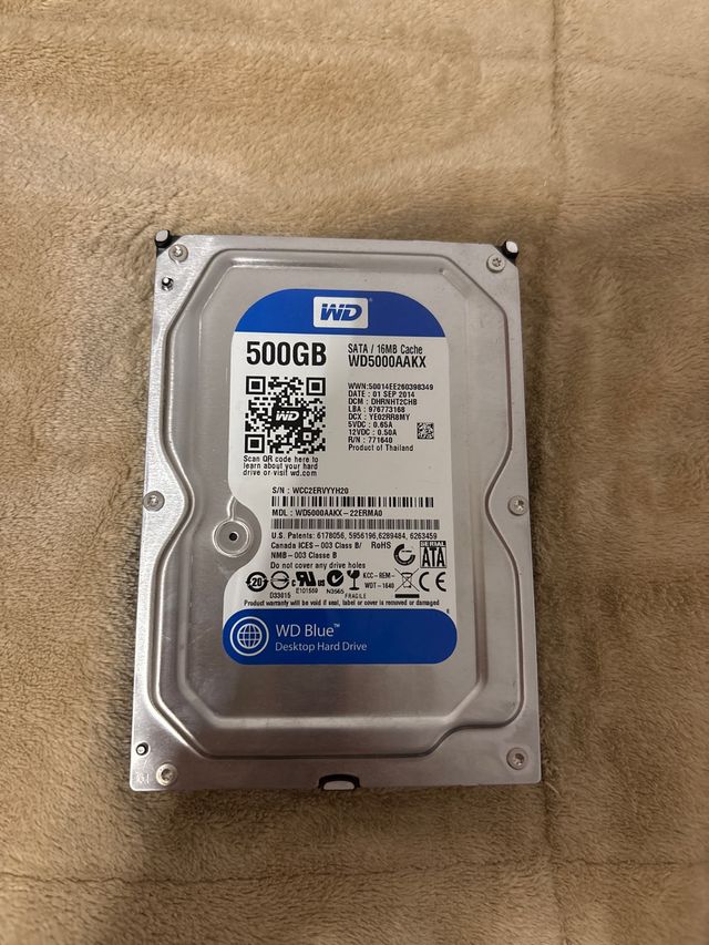 Disco duro interno WD Blue de 500 GB. - Capacidad: 500 GB - Interfaz: SATA - Caché: 16 MB - Modelo: WD5000AAKX - Fabricado en Tailandia