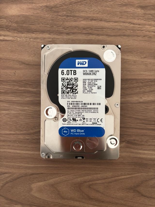 Detalles del productoVendo disco duro interno Western Digital Blue de 6TB, formato 3.5”, ideal para PC de sobremesa, almacenamiento masivo, copias de seguridad o NAS doméstico.