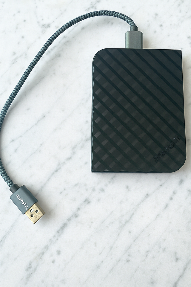 Disco duro externo Toshiba de 2 TB con acabado texturizado. - Capacidad de 2 TB. - Diseño moderno con patrón de líneas diagonales. - Incluye cable de conexión.