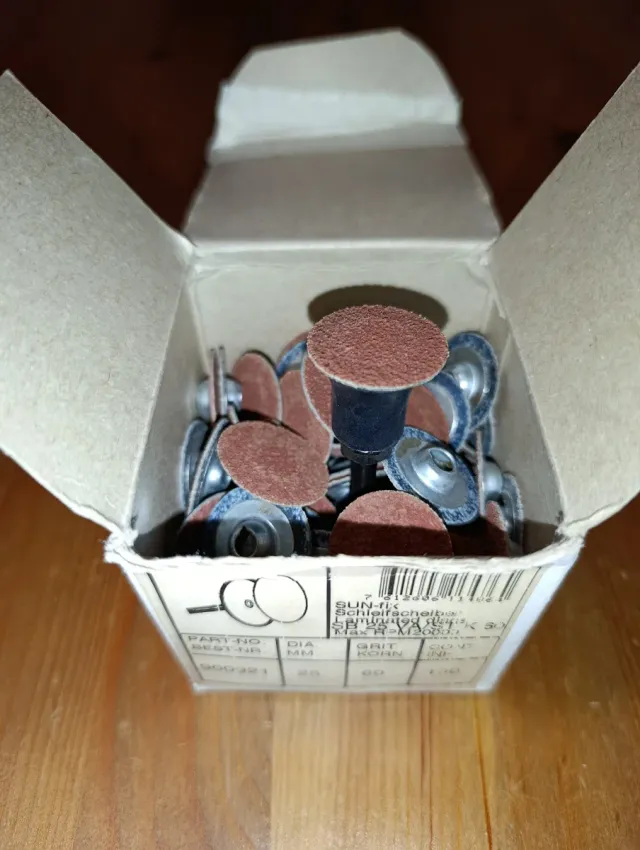 Caja de discos abrasivos SUN-fix con su adaptador - Diámetro: 25 mm. - Grano: 60. - RPM máx.: 20000.