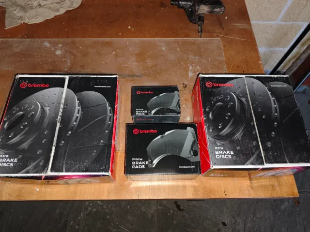 Detalles del productoSe vende un juego de discos de freno Xtra (delantero y trasero) y pastillas de freno Prime (delanteras y traseras) de la marca Brembo y un juego de tornillos para las ruedas.