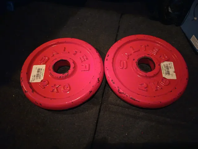 Par de discos de pesa de color rojo, cada uno con un peso de 2 kg. - Peso: 2 kg cada disco. - Color: Rojo. - Material: Hierro fundido.