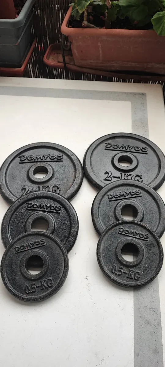 Conjunto de discos de pesas de la marca DOMYOS. - Dos discos de 2 kg cada uno. -Dos discos de 1 kg cada uno - Dos discos de 0.5 kg cada uno. - Material: Hierro fundido.