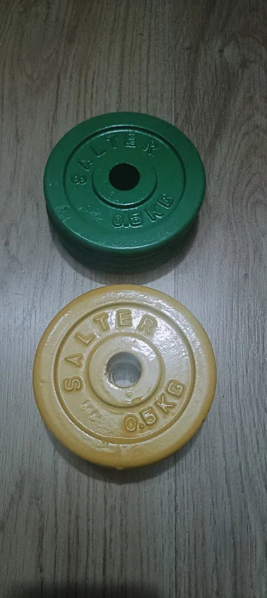 Detalles del producto8 discos de pesa de la marca Salter, cada uno con un peso de 0.5kg.total 4Kg Ideales para complementar tu equipo de entrenamiento.