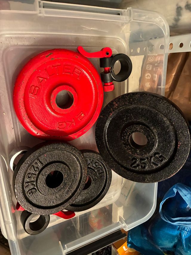 Detalles del productoConjunto de discos de pesa de la marca Salter alguas, ideales para entrenamiento.