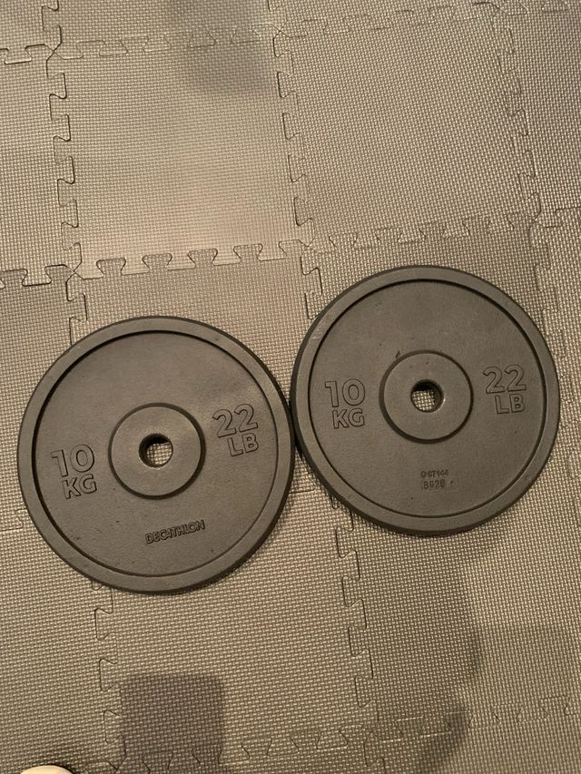 Detalles del productoSe venden dos discos de pesas de 10 kg cada uno, equivalentes a 22 lb. Ideales para complementar tu equipamiento de gimnasio en casa.