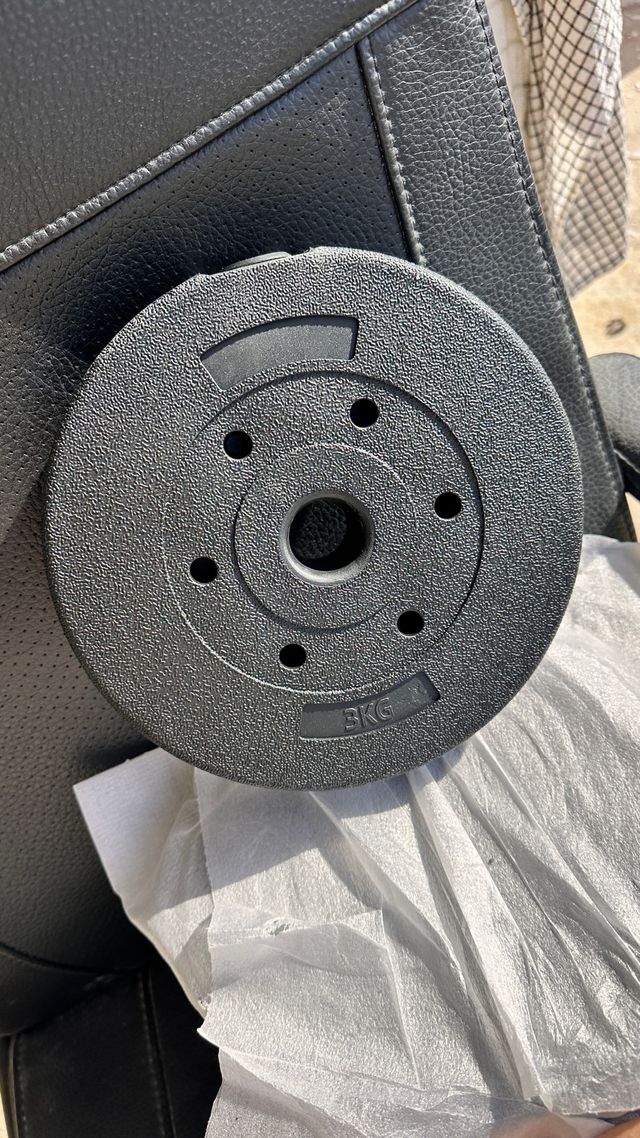Discos de pesas de 3 kg cada una Tengo hasta 24kg Adaptables a una barra o mancuerna Por unidad 6€ La caja completa 40€