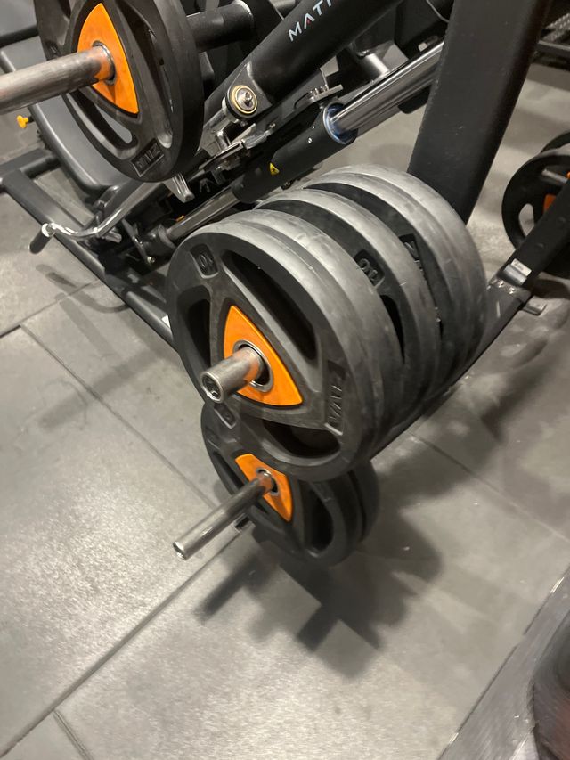 Discos de pesas para mancuernas, ideales para tu entrenamiento. - Diseño con borde naranja. - Agujero central para barra.