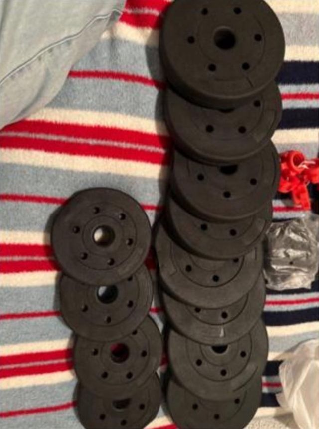 Conjunto de discos de pesas negros, ideales para equipar tu gimnasio en casa. - Material resistente. - Diseño con orificios para fácil agarre.