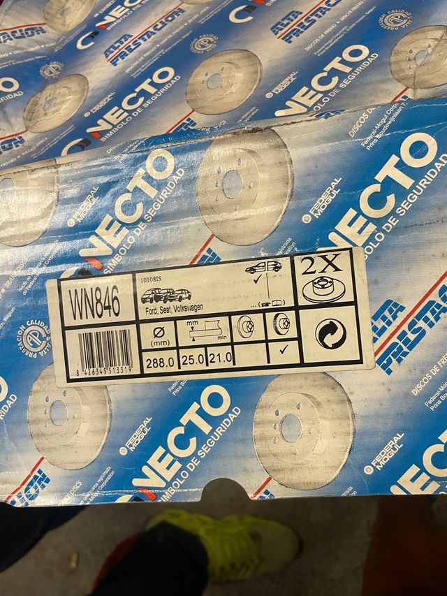 Detalles del productoDiscos de freno nuevos para Ford Galaxy, Seat Alhambra y Volkswagen Sharan. Son dos discos de freno. - Medidas: 288.0 mm de diámetro, 25.0 mm de grosor mínimo, 21.0 mm de grosor mínimo. - Marca: Necto. - Referencia: WN846.