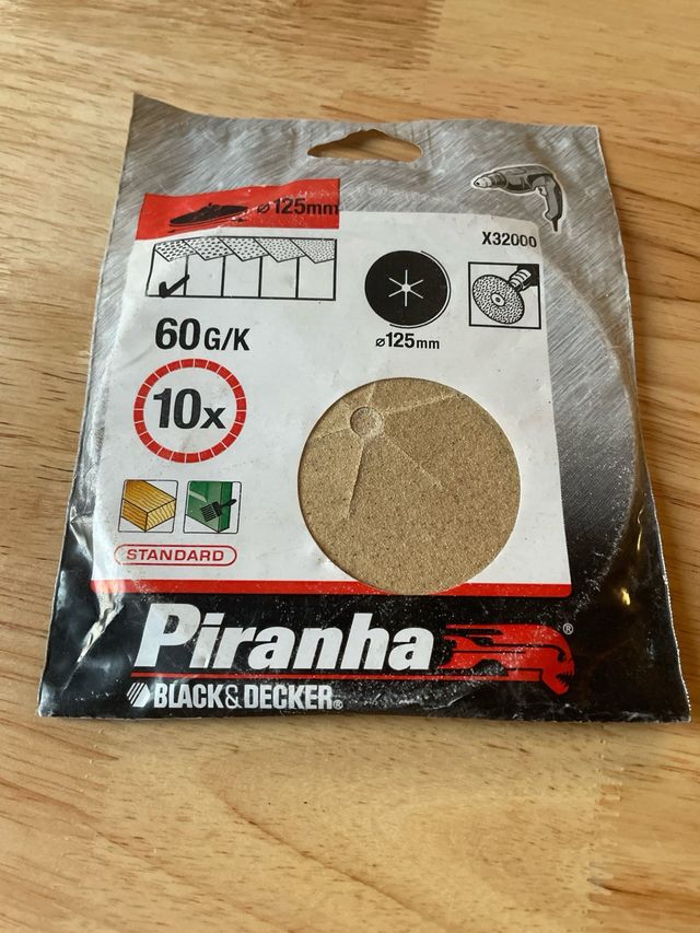 Detalles del productoPack de 10 discos de lija Piranha (Black & Decker), diámetro 125 mm, grano 60. Compatibles con lijadoras orbitales de este tamaño. Ideales para madera, metal y otros materiales, perfectos para trabajos de bricolaje y renovación. El paquete está cerrado y sin usar. Una opción práctica para quienes buscan consumibles de calidad para sus proyectos de carpintería o restauración.