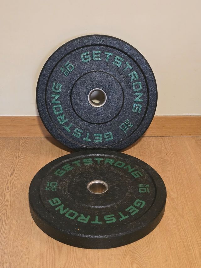 Detalles del productoSe venden dos discos de peso olímpico de 10kg cada uno, de la marca GetStrong, hybrid hi-temp. Son de color negro con detalles en verde. Como nuevos.