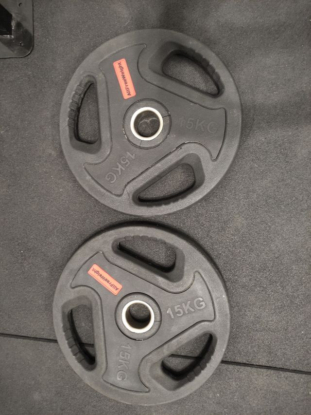Detalles del productoPareja de discos de 15kg cada uno olímpicos de 50mm de la marca All Free Weight.