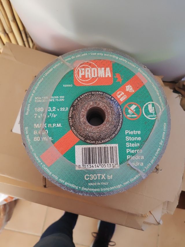 Detalles del productodiscos para amoladora, radial, discos de 180, son para piedra. marca proma, son antiguos pero buenos, son restos de mí antiguo trabajo. hay 2 packs, pongo precio de 1 pack de 10 unidades y peso
