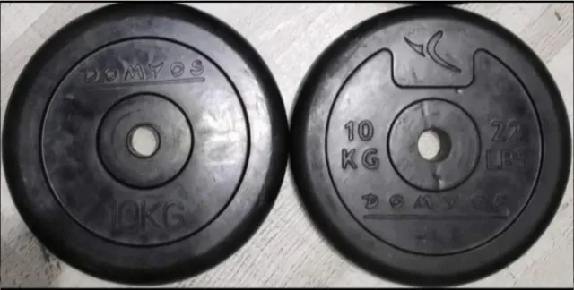 Detalles del productoVendo discos pesas de metal cubiertos de caucho de 10kg marca Domyos, diámetro 28 mm.